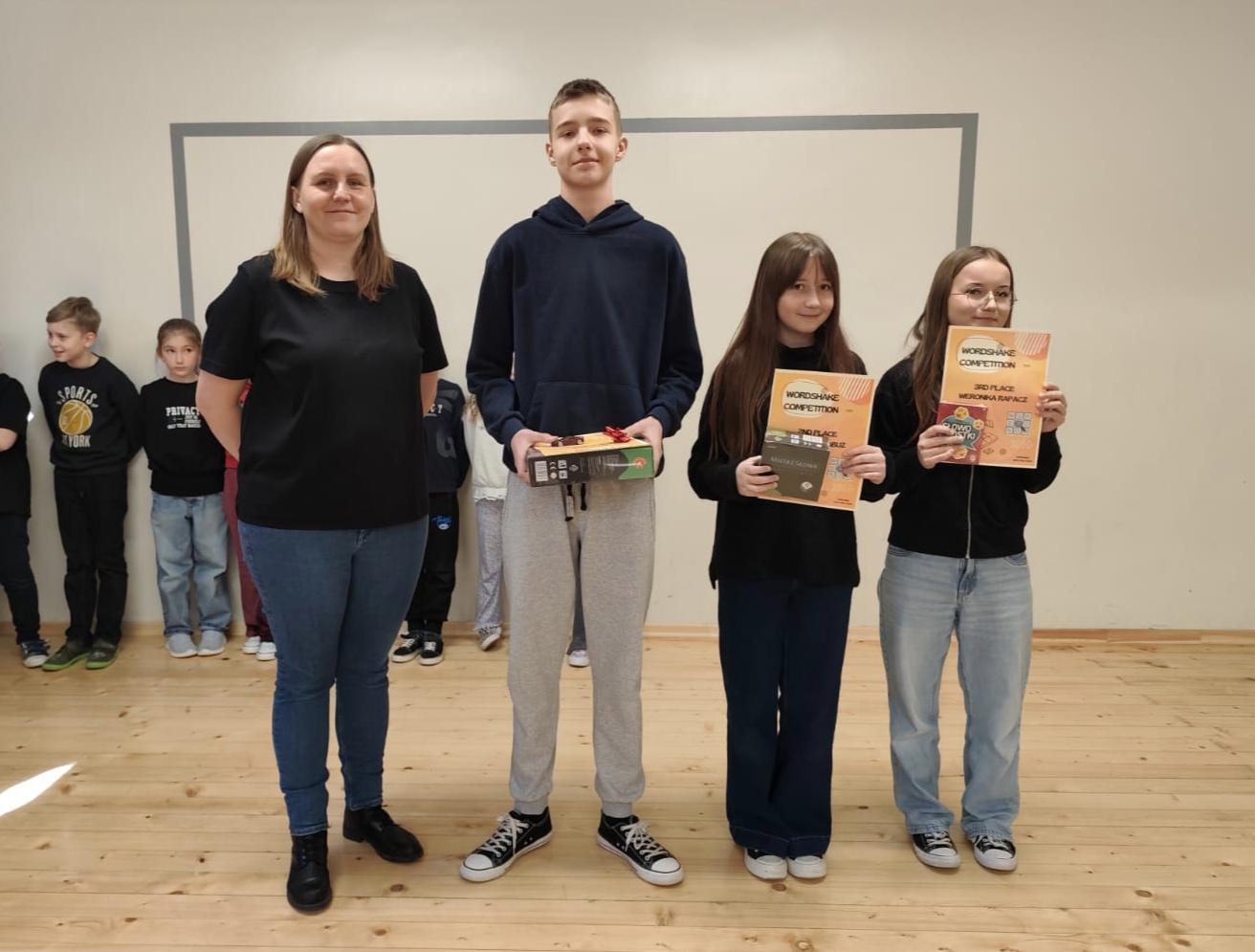 Od wtorku do czwartku w naszej szkole trwały kolejne rundy I Szkolnego Konkursu Wordshake. W konkursie wzięło udział 26 uczniów z klas IV-VIII, którzy zmagali się z układaniem słówek w języku angielskim. Po zakończeniu eliminacji, ćwierćfinału, półfinału i finału miło nam ogłosić, że mistrzem Wordshake w naszej szkole został Patryk Zborek z klasy VII. II miejsce zajęła Lena Harkabuz z klasy VI, a III Weronika Rapacz z klasy VII. Najlepsi uczniowie otrzymali dyplomy i gry językowe, a zwycięzca - zgodnie ze swoim życzeniem - został dumnym właścicielem nowiutkiego czerwonego Ferrari... Gratulujemy wszystkim uczestnikom konkursu!