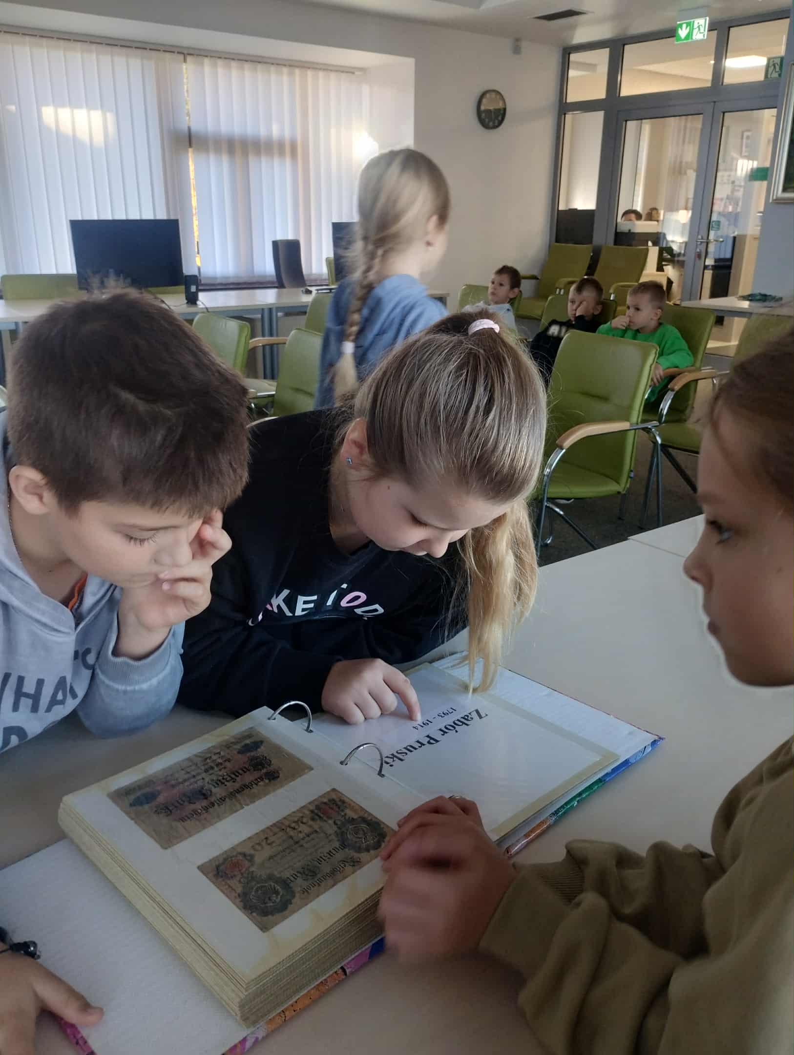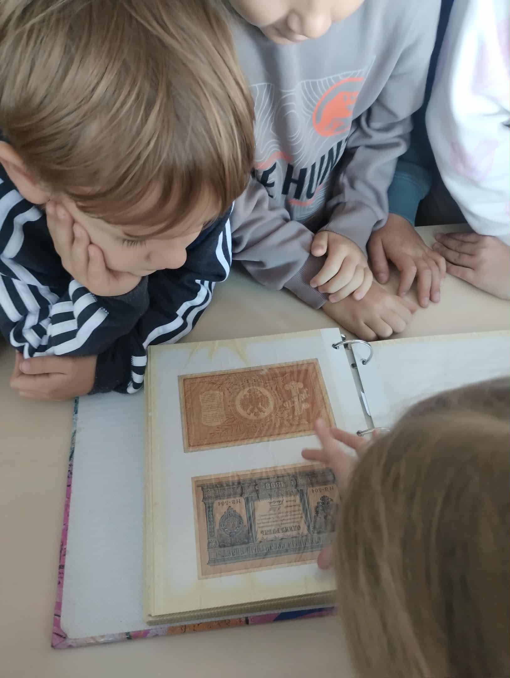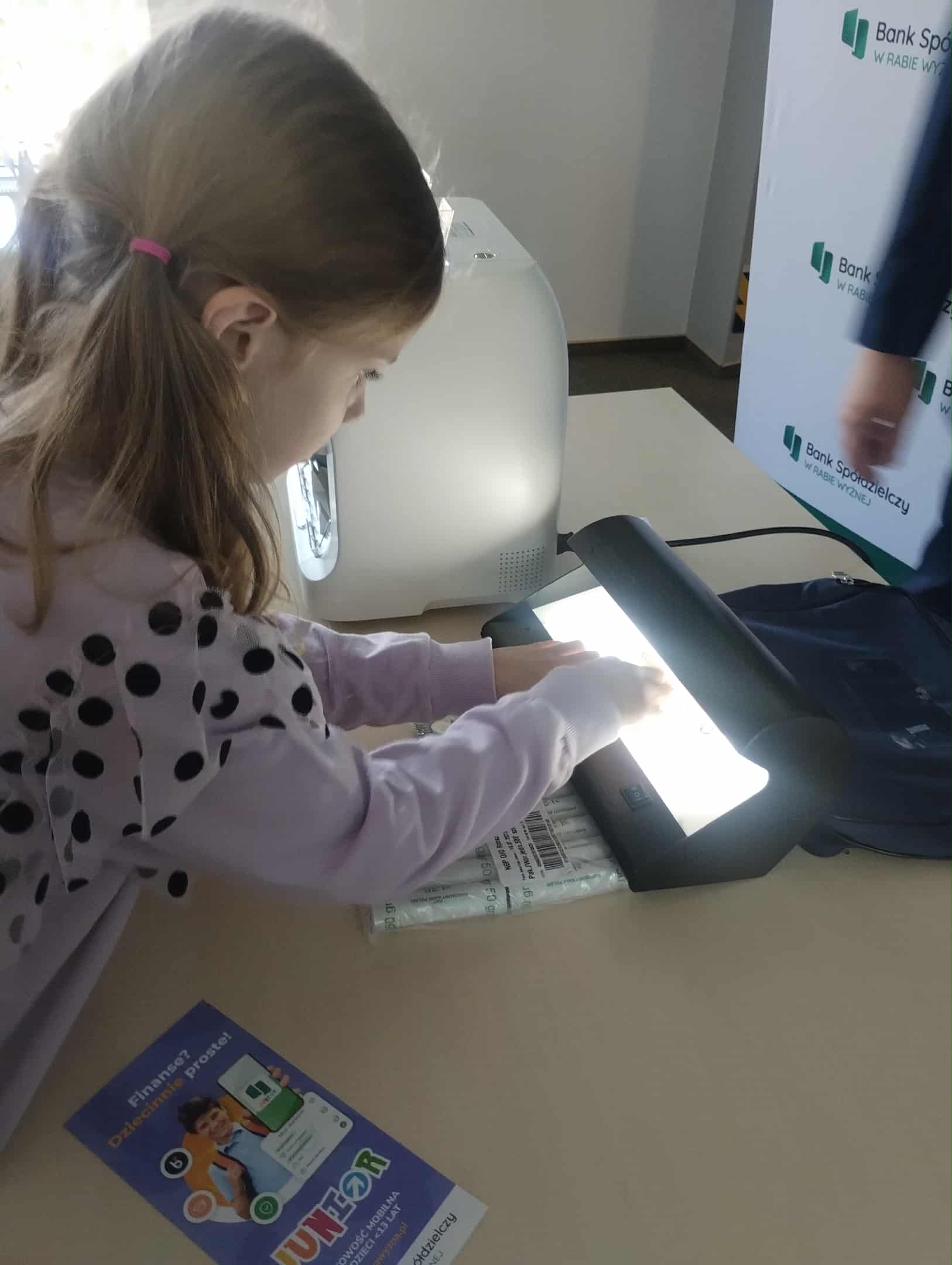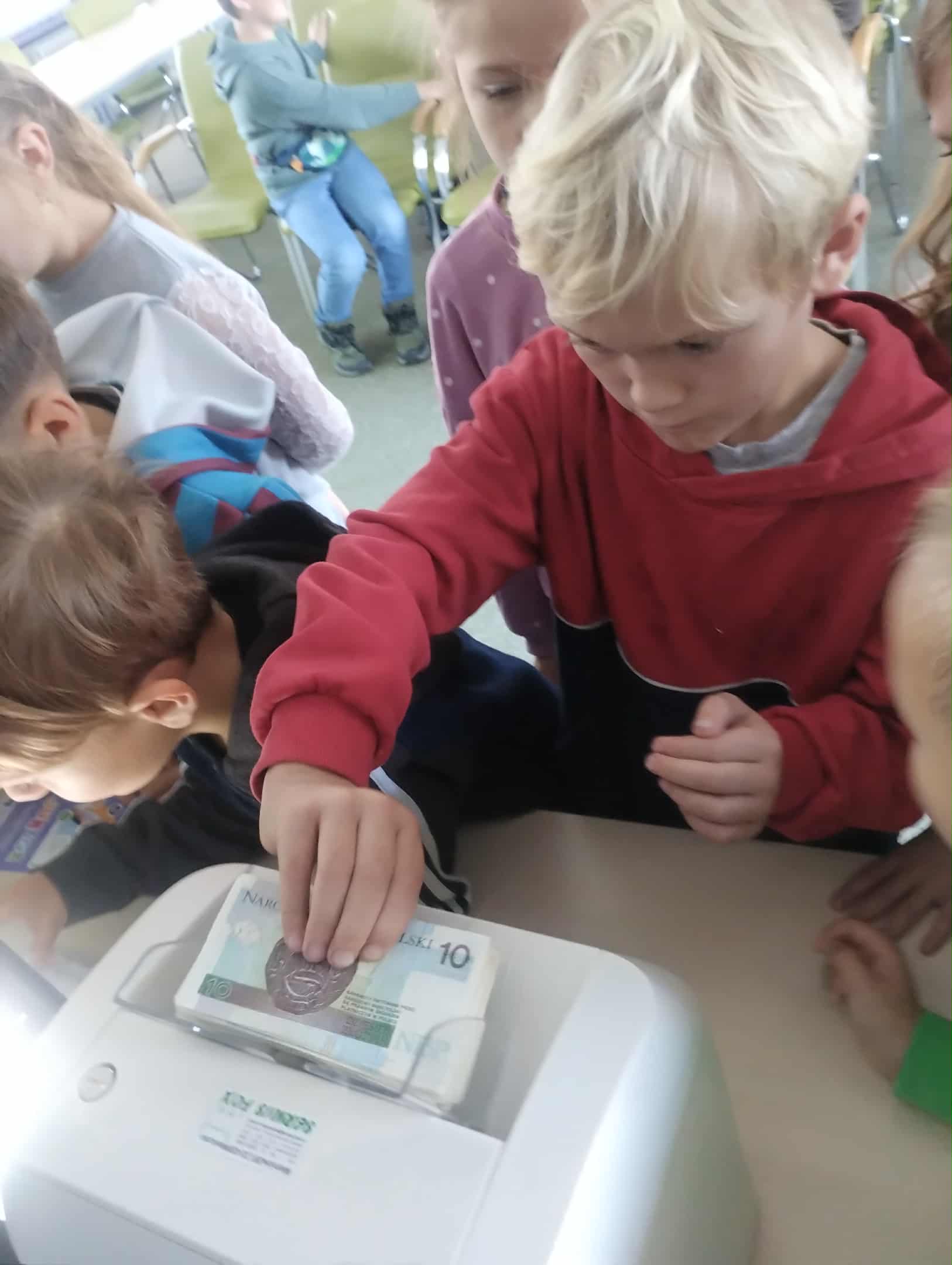 Następnie odbyła się prezentacja na temat historii pieniądza – od dawnych form wymiany towarów, przez monety i banknoty, aż po współczesne karty płatnicze i bankowość elektroniczną. Uczniowie mogli obejrzeć stare monety i banknoty oraz dowiedzieć się, jak zmieniały się środki płatnicze na przestrzeni lat, obsługiwali także liczarkę banknotów.